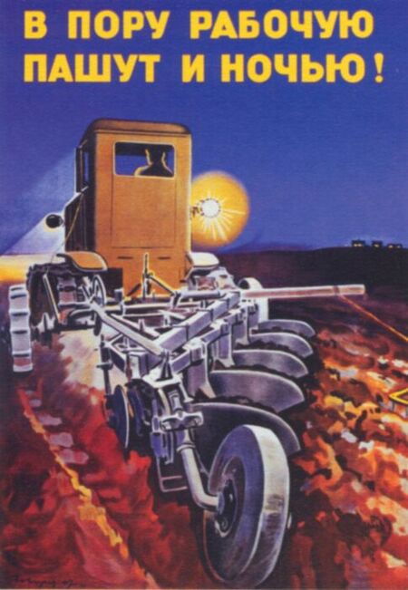 Б. Решетников. «Ночь — работе не помеха!». 1956 год. / В. Говорков. «В пору рабочую пашут и ночью!». 1947 год.