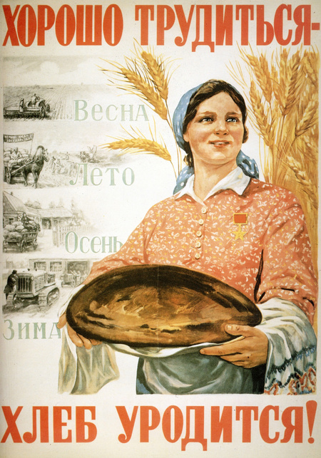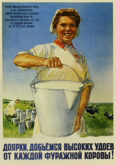 Б. А. Зеленский. «Доярки, добьемся высоких удоев от каждой фуражной коровы!». 1950 год. / М. М. Соловьев. «Хорошо трудиться — хлеб уродится!». 1948 год.