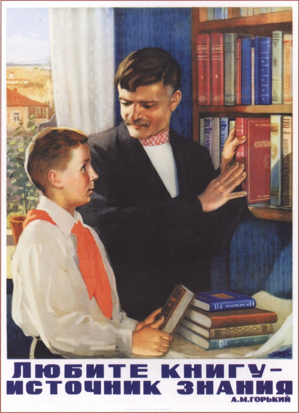 Н. Вигилянская, Ф. Качелаев. «Все умеем делать сами, помогаем нашей маме!». 1960 год. / А. М. Горький. «Любите книгу — источник знания». 1952 год.