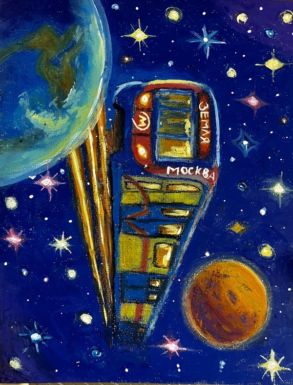 На рисунке изображено московское метро, мчащееся сквозь бескрайние просторы космоса. Этот рисунок воплощает мечту о путешествиях за пределы нашей планеты, объединяя знакомое и фантастическое в одном кадре.