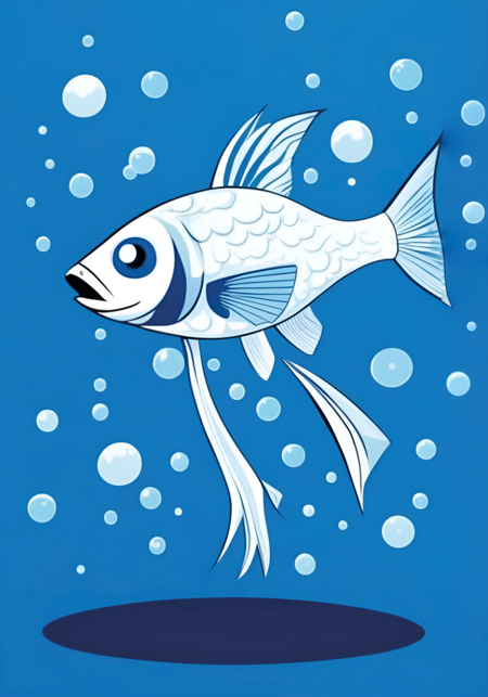 fish with legs, vector image, fish white, contour white, minimalism, bubbles, only white and blue, vector, poster