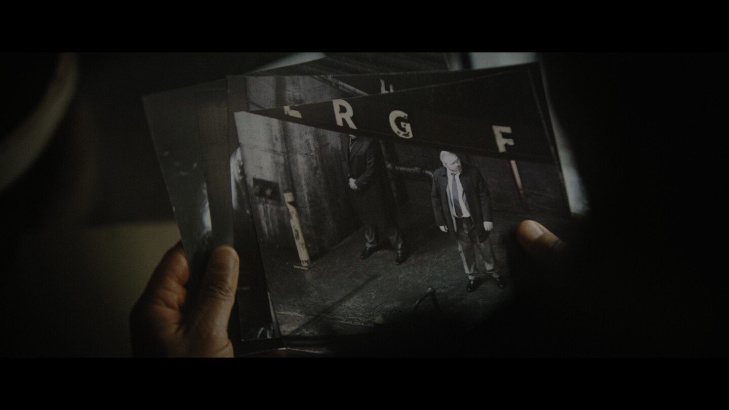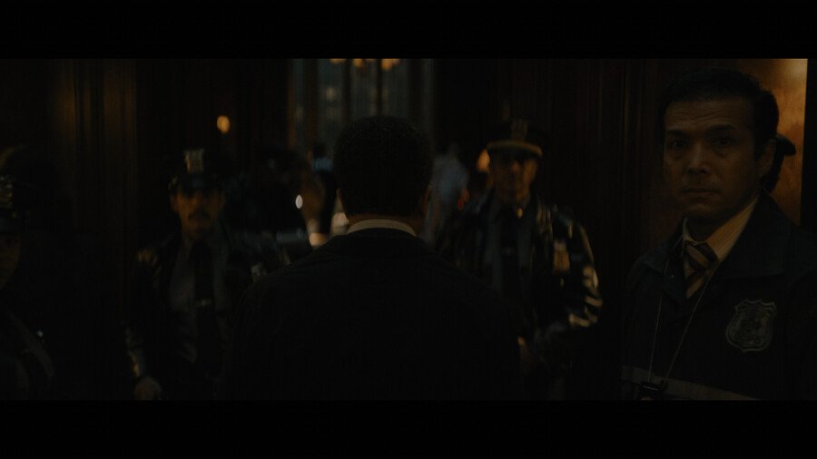 Подавляющая часть кадра занята ненужными объектами: пол, боке заднего плана, блик со стороны. Герой здесь уже не главный, что подчеркивает его нежелание отсвечивать на сцене преступления, и передвигаться по ней словно призрак.