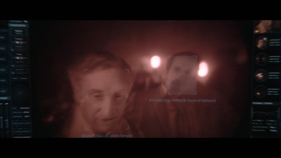 Пример субъективности появляется в начале, где серия кадров сравнивает свет двух прожекторов. Источником одного из них является полицейский вертолет, который патрулирует улицы. Но преступники не боятся местной полиции. Даже после того, как на них попадает этот свет, они не пытаются бежать. Синеватый холодный прожектор противопоставляется яркому оранжевому свету бэтсигнала — специального фонаря с эмблемой ночного мстителя. С его появлением бандиты начинают осматриваться по сторонам и вглядываться в темноту. Без единой произнесенной реплики в кадре зрители понимают реальную расстановку сил в городе.
