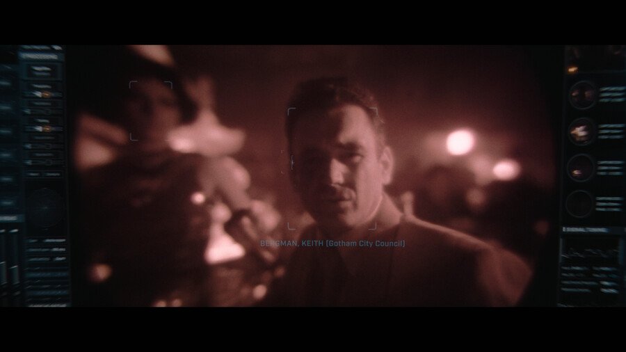 Кадры отзеркаливают первое расследование места преступления. Все взгляды тоже были направлены на Бэтмена и он пытался спрятаться, быть менее заметным. В некотором роде официантка в закрытом ночном клубе — столь же неприличное и безнравственное занятие, сколь и переодевание в костюм летучей мыши в ночи. Режиссер снова обращается к идентичной композиции.