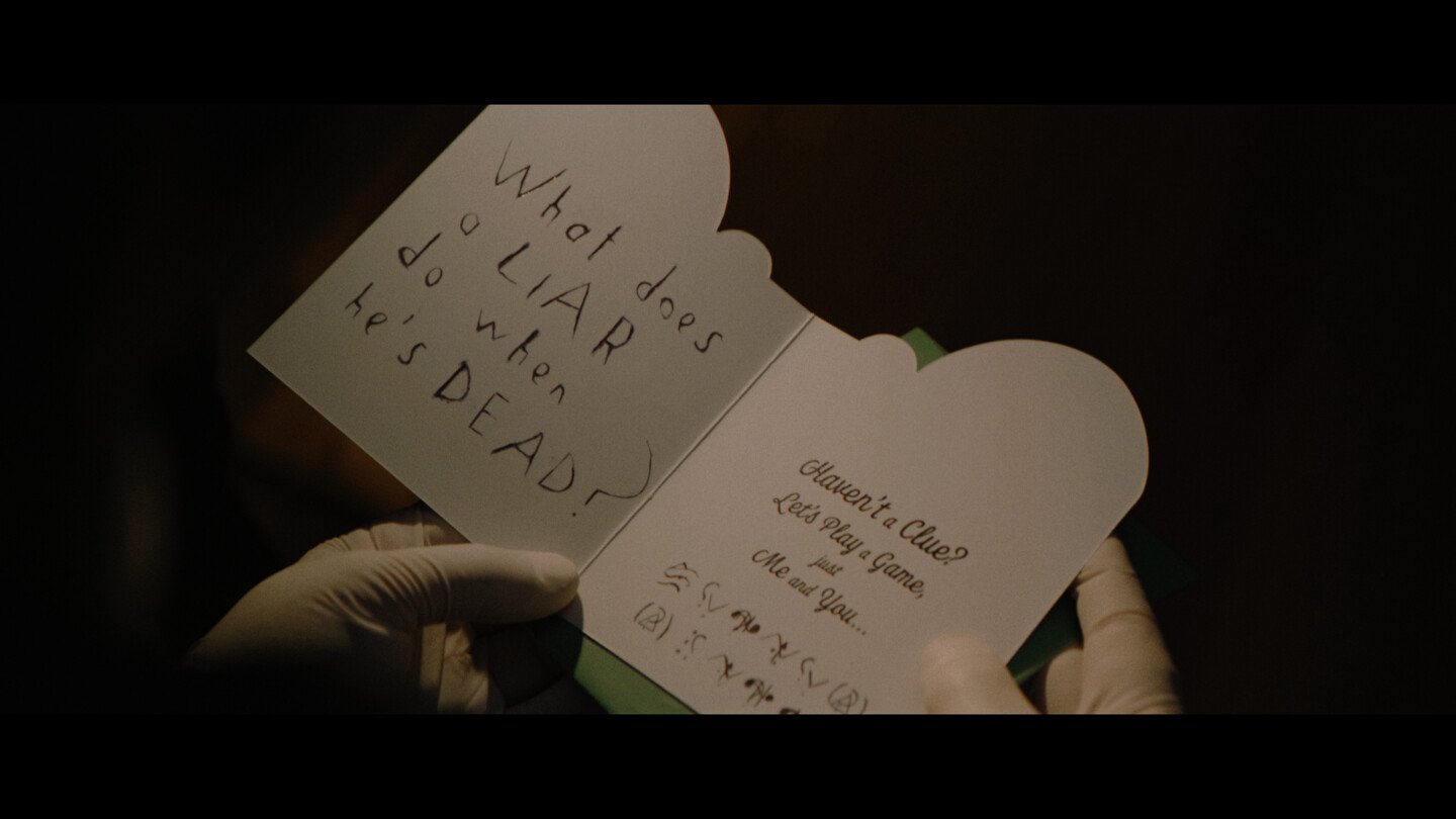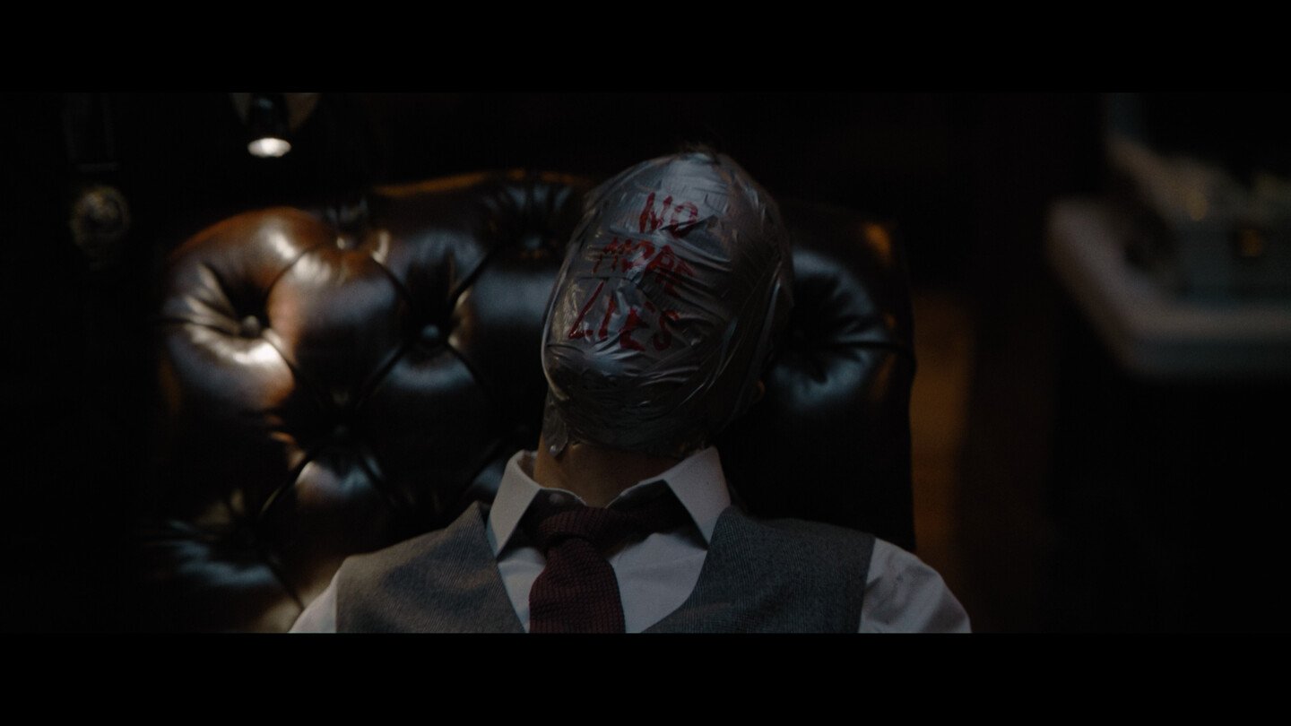 Маска Загадочника играет другую роль. Она не скрывает лишь глаза, но даже поверх них маньяк носит очки. Глаза — самый важный элемент. Не зря в первой сцене прямого контакта с Бэтменом разговор идет по телефону. В маленьком экране вновь чаще всего мелькают глаза. Их одних хватает, чтобы передать характер. Каждая реплика сопровождается безумными взглядами, злостью, ненавистью. Настоящий маньяк и серийный убийца.