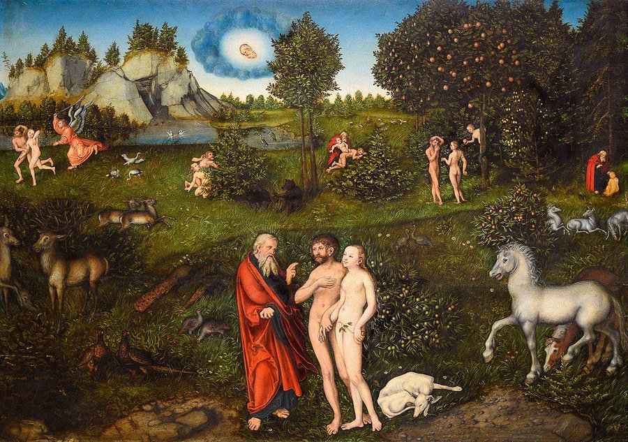 [1] Адам и Ева в саду Эдема — Лукас Кранах Старший, 1530; [2] Сотворение Адама — Фреска Микеланджело, 1511; [1] Эдемский сад — Ян Брейгель Старший (1568-1625)