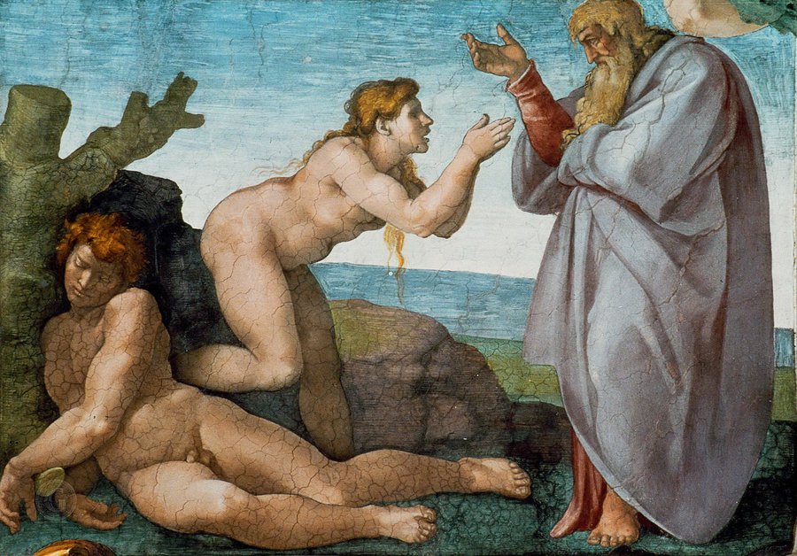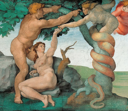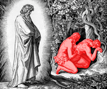 После вкушения запретного плода, когда Бог изгоняет Адама и Еву из Рая, они испытывают стыд, осознание потери и не проявляют ответственность за содеянное. Когда Бог призывает их к ответу они пытаются обвинить кого-то и перекладывают вину на друг друга и доходит до того, что Адам обвиняет в содеянном Бога «это Ты мне дал эту жену, она меня соблазнила».
