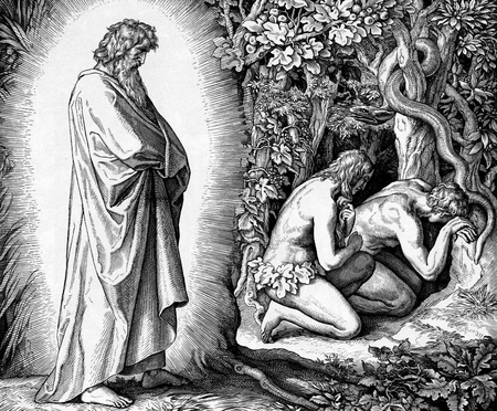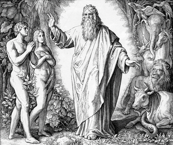 По библии в начале времен Бог создал Адама из праха земного и поселил его в Эдемском саду или в Раю. Адаму была дана задача возделывать и сохранять сад, здесь он находился с Богом, ухаживал за землей и был с животными. Но через какое-то время Бог создал Еву из ребра Адама. В Раю у Адама и Евы было всё, они жили в радости, ухаживали за садом и были с Богом, но у них было одно единственное правильно, которое нельзя было нарушить: Бог запретил есть плоды с Древа познания добра и зла. Но они его нарушили, когда змей искусил Еву. Ева вкусила плод с дерева и соблазнила Адама тоже вкусить его. Вкусив плод, Адам и Ева захотели стать равными Богу и за это Бог изгнал их из Рая.