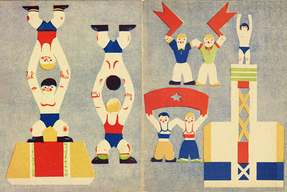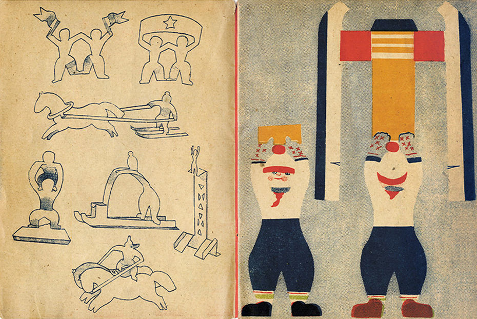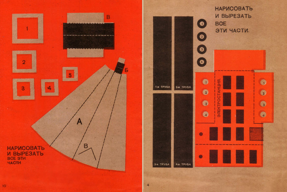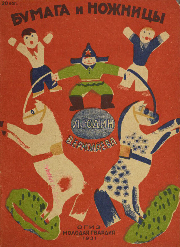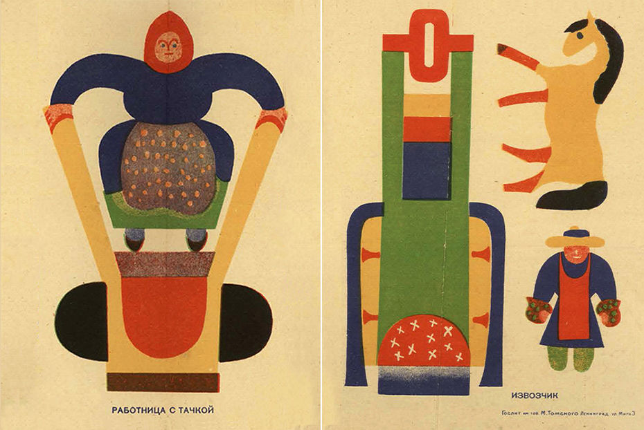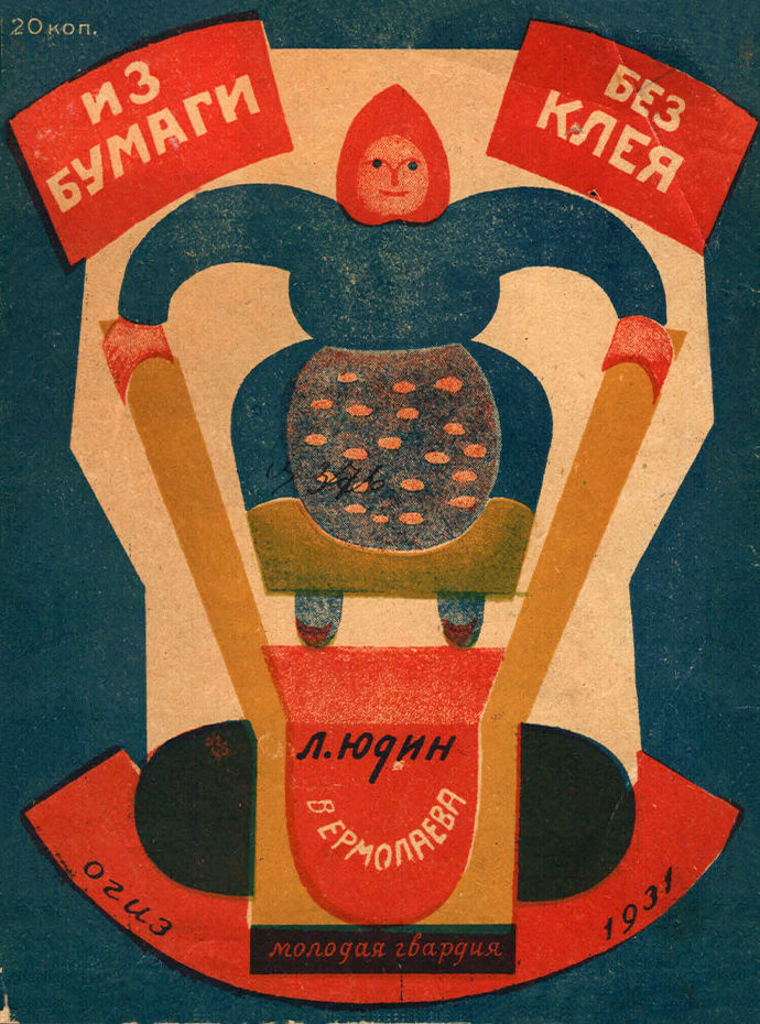 Говоря о книгах-вырезалках, нельзя не упомянуть вновь имя Веры Ермолаевы. Вместе с Львом Юдиным, который также принадлежал к кругу соратников Казимира Малевича и много работал в сфере детской литературы, она в 1931 году разработала книги «Из бумаги без клея» и «Бумага и ножницы». Детям предлагалось вырезать и собирать фигурки персонажей новой эпохи: рабочих, крестьян, участников спортивных соревнований и демонстраций. Все фигурки были идеально сконструированы, легко вырезались и не требовали дополнительных материалов. В этих книгах художники проявили себя не только как иллюстраторы, но в большей степени как конструкторы или даже инженеры.