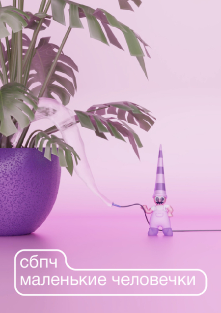 Исходя из текста, я решила не встраивать маленьких человечков в нашу реальность, а создать им новую и чистую вселенную, где они тайно правят нашим бытом. В визуальном ряде специально не появляется ни один большой человек, чтобы показать значимость человечков в нашей жизни. Получившийся визуальный стиль это сочетание яркой 3д-картинки и простого шрифта.