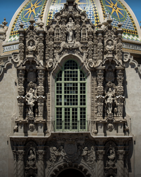 «Калифорнийский четырёхугольник» — комплекс зданий, служащих входной группой к экспозиции музея. На фасаде — скульптуры колонизаторов. Источник изображения: www.artsandculture.google.com