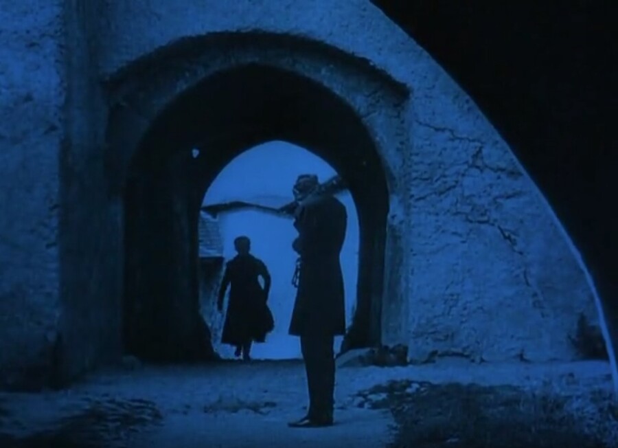 Зрители впервые видят Орлока в арке города. Он, словно смерть на пороге дома, смирно стоит и ждет своего времени. Контровой свет добавляет еще больше жути в появление героя.