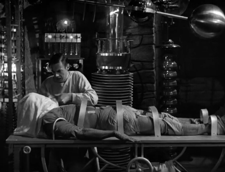 Лаборатория, в которой работает доктор, состоит из множества устройств, их все показывают зрителю, демонстрируя его размер и величие и будто насмехаясь над научным вытеснением религии. Само рождение монстра неестественно, безбожно. Во время поднятия тела доктор произносит: «It`s alive!», будто сам не веря в происходящее.