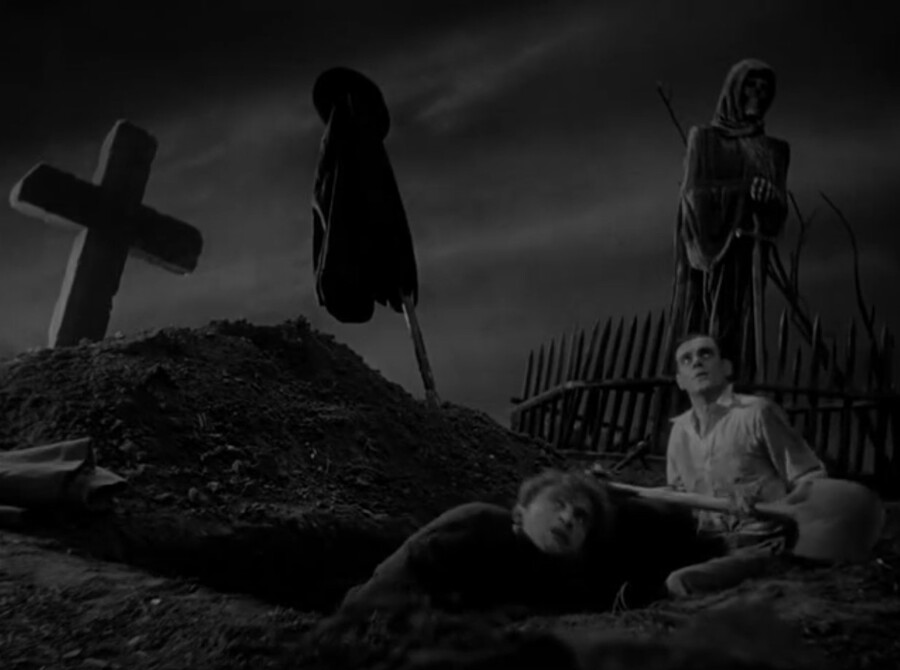 Доктор Франкенштейн вместе с Фрицем выкапывают труп на кладбище, нарушая привычные нормы морали и религиозные установки. Этим действием они словно связывают науку с некромантией и насылают на мир проклятье.