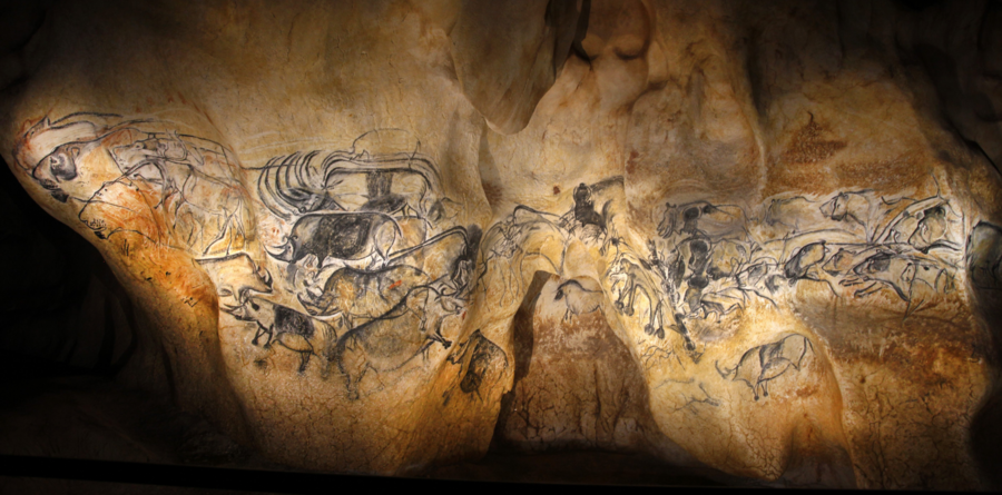 Пещера Шове, ок. 32 000 до н. э. Прерывистые линии и контраст угля с фоном создают эффект зверей, возникающих из мрака. Уголь и охра по скале.