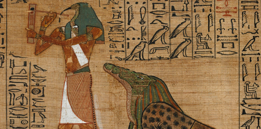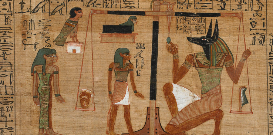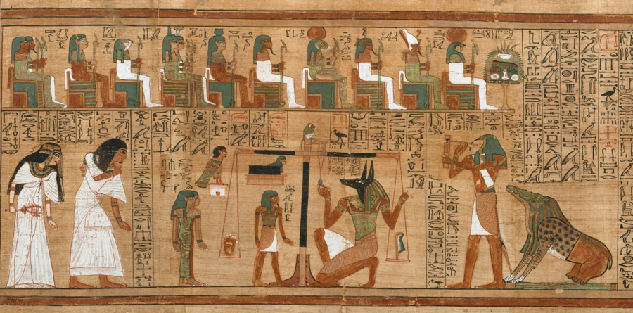 «Взвешивание сердца», Египет, XIV в. до н. э. Ритуальная сцена с идеальной композицией и строгой иерархией фигур отражает принцип космической меры. Папирус, минералы.