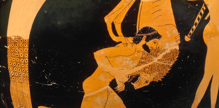 Геракл и Немейский лев, греческая ваза, V в. до н. э. Схватка героя и льва подчёркнута контрастом линий и фактур. Керамика, чернофигурная техника.