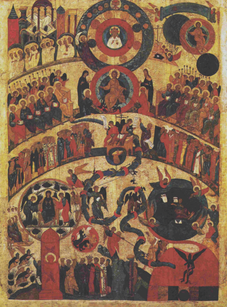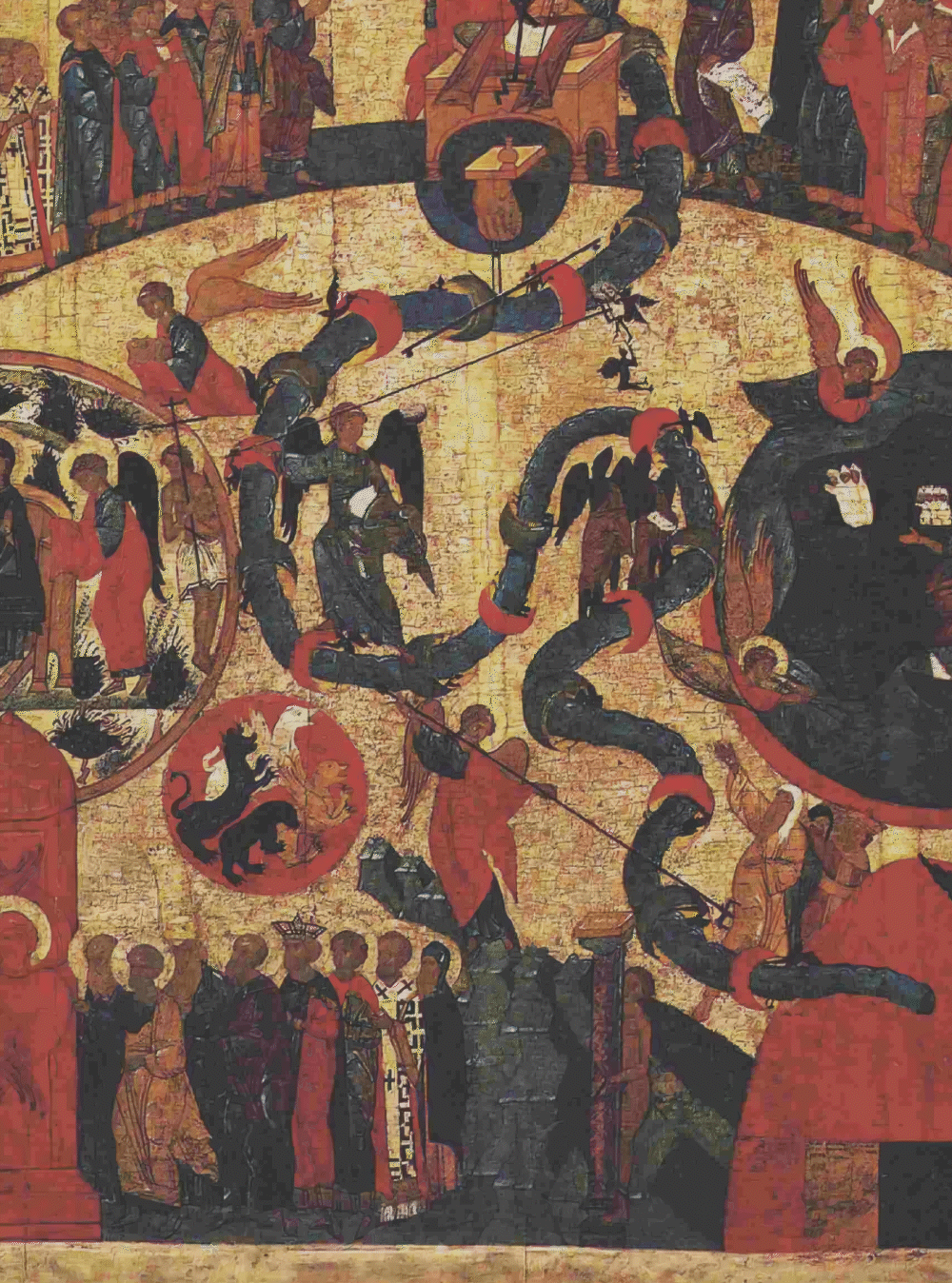«Страшный суд», Новгород, XIV в. Вертикальная иерархия света и тьмы формирует путь души; верх — золото, низ — хаос фигур. Икона, темперная живопись.