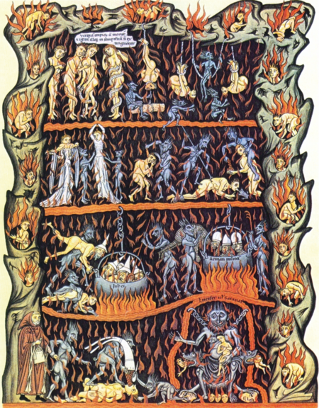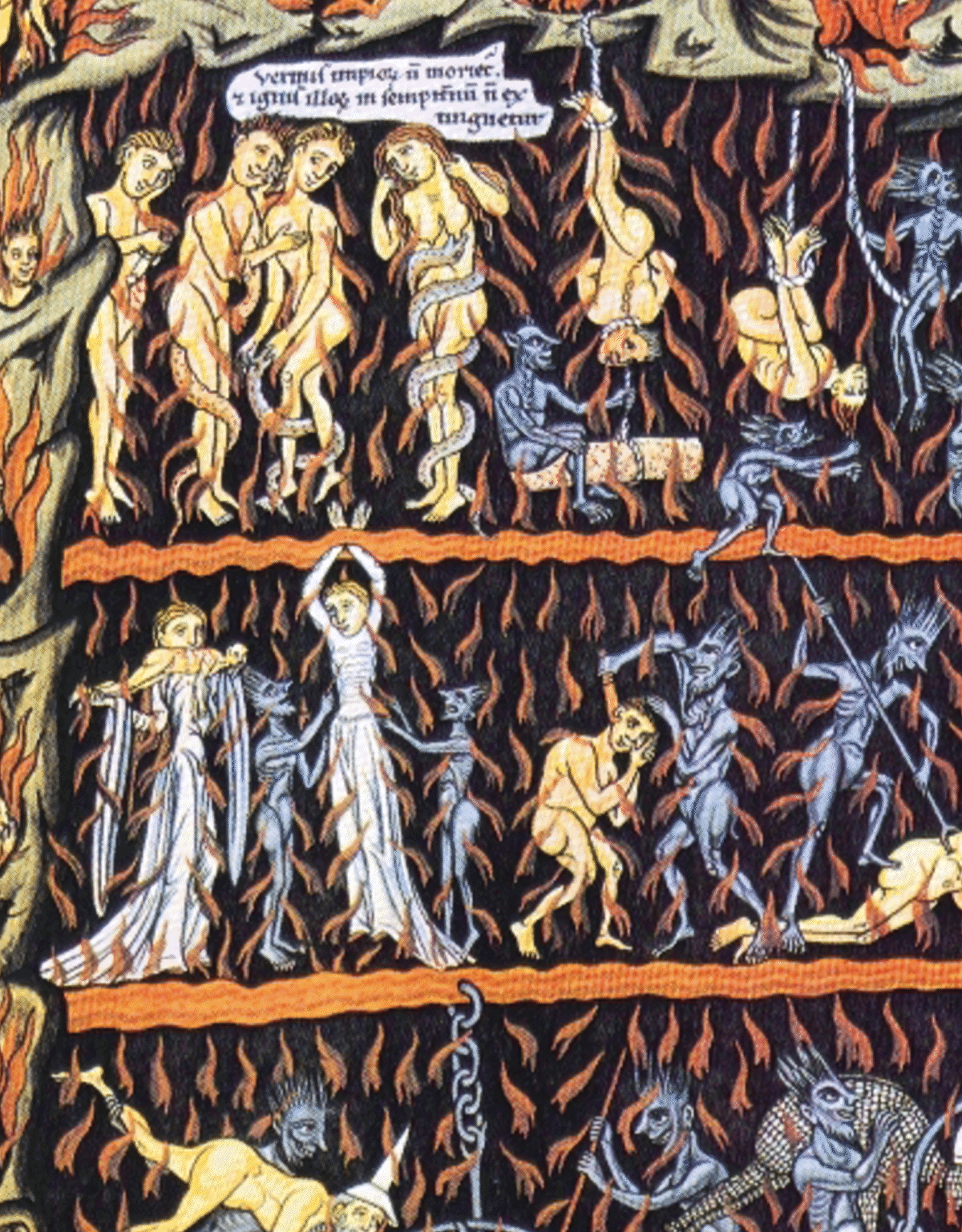 «Ад», Hortus deliciarum, ок. 1180 Центральная пасть чудовища и хаотичные фигуры создают образ мира без меры, где формы и движения искажены. Яркие контрасты подчёркивают тревожный характер сцены.