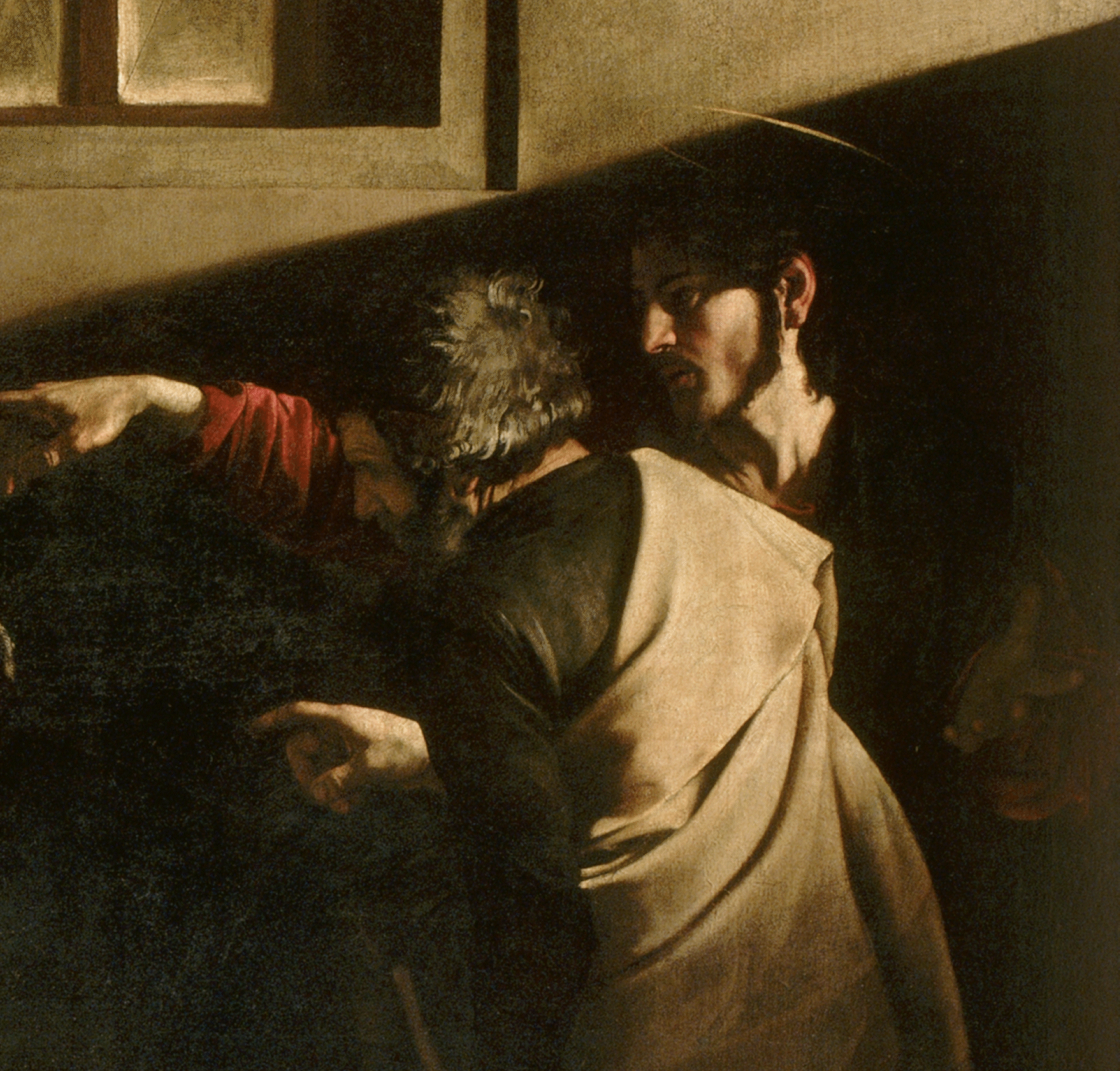 У Караваджо в «Призвании Матфея» свет буквально вмешивается в пространство. Резкий диагональный луч прорезает темноту комнаты и падает на Матфея, фиксируя момент выбора. Лица и жесты персонажей подчеркнуты контрастной светотенью: руки, приподнятые брови, поворот головы — всё превращено в мгновенное эмоциональное движение. Тень плотная, глубоко поглощающая фон, что усиливает ощущение драматического разрыва между прошлым и внутренним прозрением.