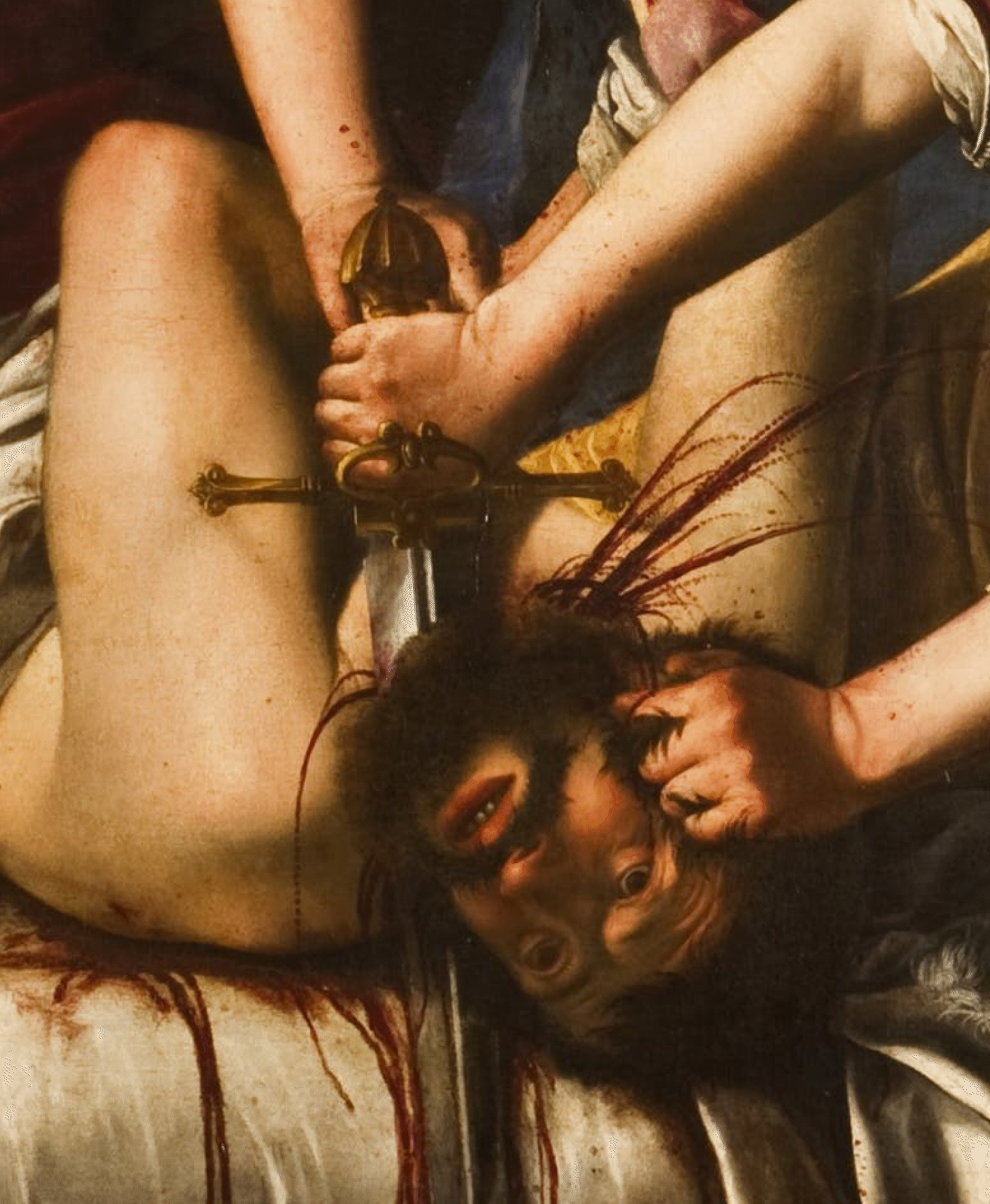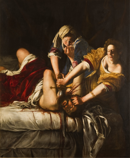 Артемизия Джентилески, «Юдифь, обезглавливающая Олоферна», 1612–1613 Резкая светотень и близкая композиция усиливают напряжение решающего действия; жесты героинь передают силу и волю. Масло по холсту.