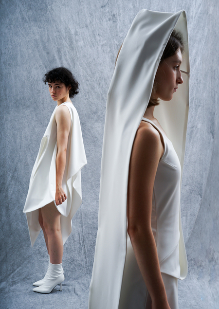 Для тизера я выбрала одну из глав из своего визуального исследования — тему невесомости. Мне было интересно, как одежда ведёт себя в условиях отсутствия притяжения и как можно передать это состояние через форму. В моих эскизах не вся одежда летает, а только отдельные элементы, например, лямки, края ткани или детали, которые как будто приподнимаются. А также чтобы некоторые части выглядели так, словно они движутся сами по себе, немного оторваны от тела.