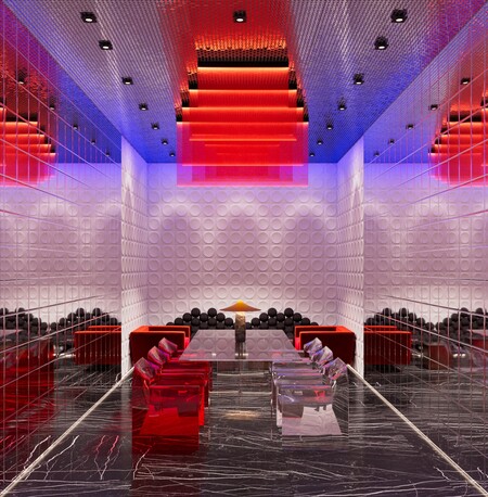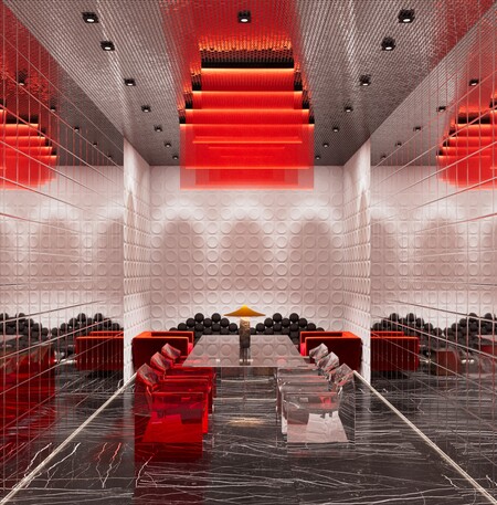 В интерьерах ресторана используются формы, текстуры и материалы, отсылающие к архитектуре Запада и интерьерам Востока (металл, зеркальные панели, декоративный камень, красный цвет, куб и круг как основные формы).