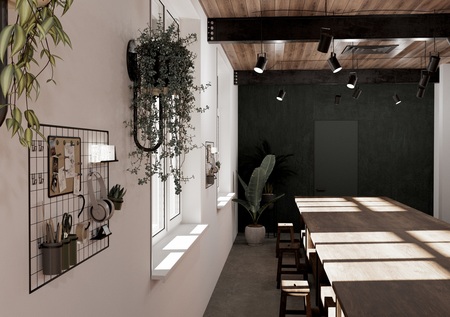 Это гибкое, многофункциональное пространство в стиле современного минимализма с теплыми акцентами и обилием растений.