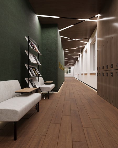 Повсюду много розеток, регулируемый теплый свет, мебель из натуральных материалов, а на стенах висят работы студентов. Пространство трансформируется под задачи, легко читается и обеспечивает чувство безопасности и уединения, когда это необходимо. Состав помещений: Лекционный зал Мастерская с кладовой Зона с индивидуальными шкафчиками Зона отдыха Компьютерный зал Кухня-столовая Кабинет преподавателя
