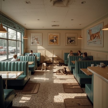 Wide shot of a cozy retro cafe interior, 1950s style, booths with teal leather upholstery, wooden tables, formica countertops, vintage posters with dogs on beige walls, terrazzo floor, hanging retro lamps with brass details, people drinking coffee and dogs lying on mats, warm beige and teal color scheme, sunny light from windows.