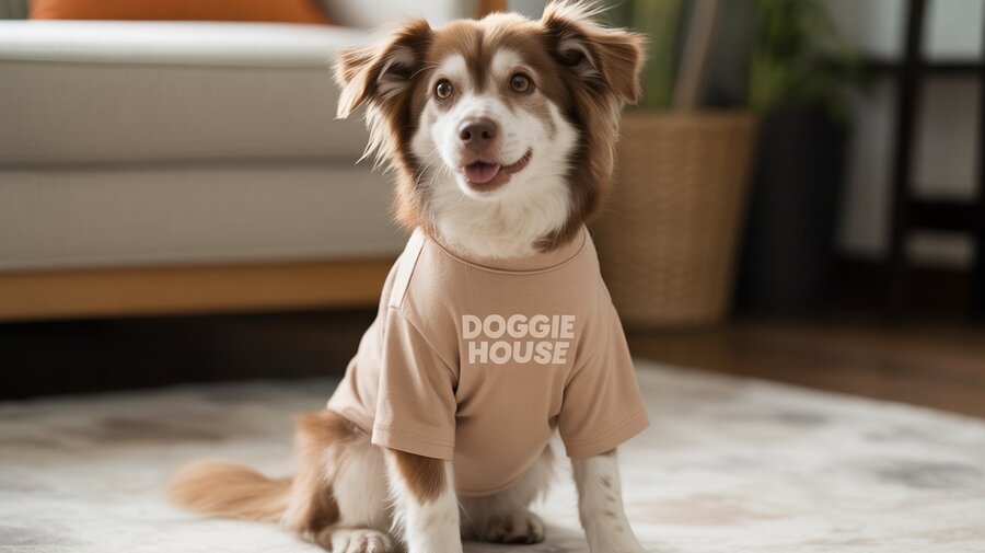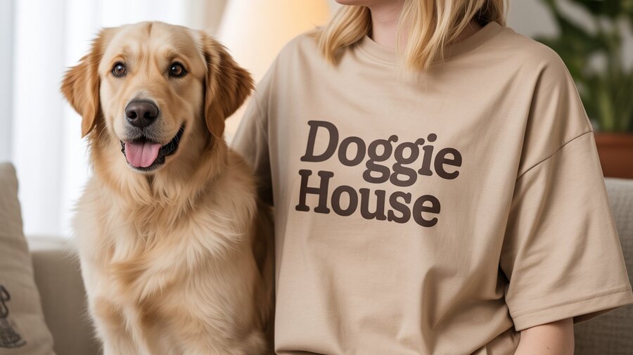 A dog in a beige T-shirt with the logo «Doggie House» in LMAO Light font.