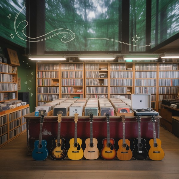Neuroneti: idegram.ai, recraft.ai, Status Diffusion Prompts: 1 — Realistic 8K wide show of a music store interior, minimalist furniture, shelves with vinyl, CDs, and instruments, all in soft paper pentil style overlay. Dark forst background outside blurred in long-exposure style. Subtle floating buildings of anxieties around the room. Hand-drawn standards on Walls, soft warm cinematic light, Dreamy, whimsical, cozy, emotively expressive mud. 2 — Realistic 8K photo of a cozy music store interior, hand-drawn pencil style products, pastel colors. Shelves filled with CDs, neatly organized, with soft crowding reflections. Dark, long-exposure forevisable through Windows, blurred like a Dreamy background. Light, etherreal haze floating inside, hand-drawn standards on walls. Minimal furniture, soft cinematic lighting, delicate texts, combining dreamlike whimsy and subtle anxiety. 3 — 8K photorialist interior of a musical story, shelves and racks filled with musical instruments: guitars, violins, keyboards. Pastel-toned pencil sketch style overlay, Dreamy atmosphere. Outside the Windows, Dark forst blurred lke long exposure. «Faint floating buildings of anxieties subtly integrated in the sun. Hand-drawn standards on Walls, soft glowing lights, cozy, calm, and whimsical.