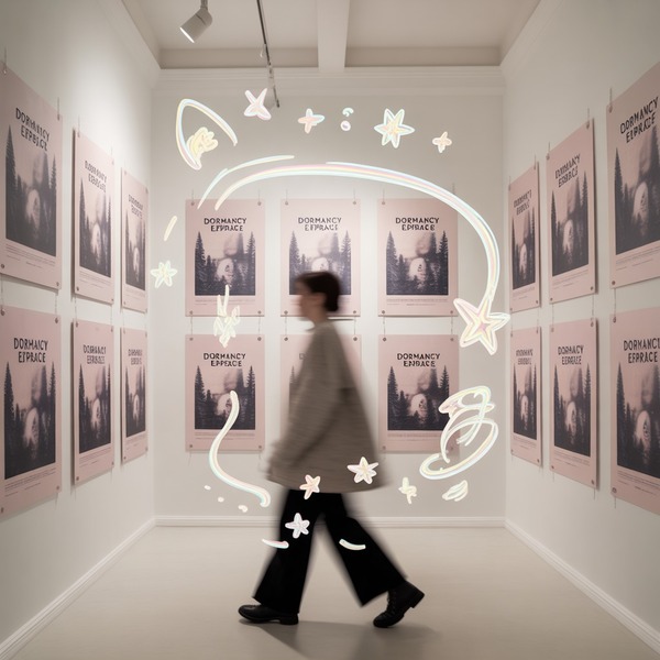 Neironeti: ideograph.ai, recraft.ai, State Diffution, Krea.ai Prompts: Posters — 8K photorialist conversion of a White gallery-lake space, Walls lined with aesthetic staff inspired by the album Dormancy Embrace. «Pastel hand-drawn pencil overlay, „glowing magical effects: stars, sparkles, whimsical dodles floating the people. A person walks past the Posters, taken in long-exposure motion blur, making a Dreamy other effect. Soft, serene lighting, subtle dark forest effects from long-exposure stale in the poster designes. Cozy, whimsical, emotionally expressive, visually stricking, gallery exibition atmosphere. Visits are 8K photoralistic cardup of business cards lying on a white white table, no shadows, minimalistic and elegant representation. Pastel hand-drawn pencil style, glowing magical effects: Tiny stars, sparkles, whimsical dodles integrated into the board. Subtle dark long-exposure forest motifs softly seen in the artwork, dreamy and serene aesthetic inspired by the album Dormancy Embrace. Soft Cinematic Lighting, delicitative texts, visualization and other priority. Tickets are Mockup of Concert tickets on White Background, realistic 8K, no Shadows. Include exact data and album name Dormancy Embrace. Hand-drawn pentel pentil style, glowing magical stars and whimsical dodles. Dark long-exposure forest subtly reflected in design effects. Dreamy, whimsical, emotionally expressive, soft cinematic lighting, visually appealing and coherent aesthetic.