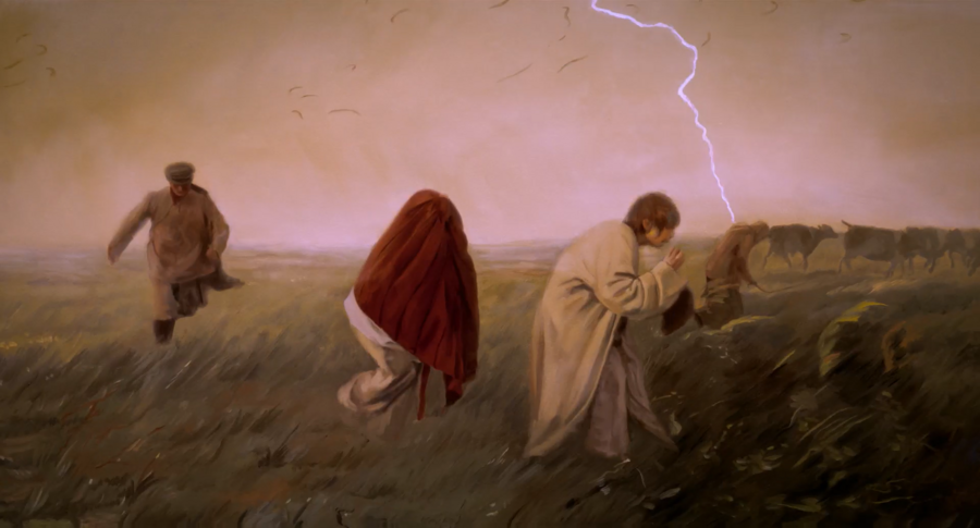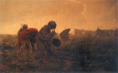 Изображая размеренный быт крестьян, потакавший всему живому, Хелмоньский пишет «Бурю», до этого набросав «Перед штормом — эскиз…». В ней он отражает уязвимость людей над силами природы и веру сельских жителей в божественные силы. Как и в сюжете картины «Буря», в фильме во время шторма люди молятся, защищаясь от напасти.