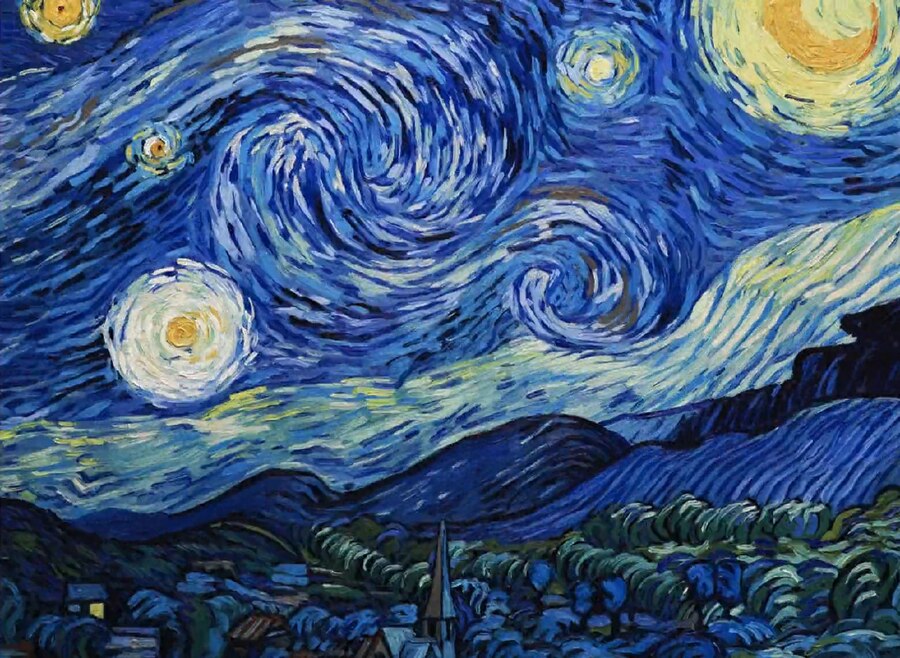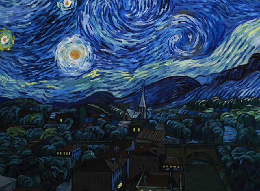 Первая сцена после вступительных титров — «Звездная ночь», являющаяся одной из самых узнаваемых картин Ван Гога. Начало событий в фильме происходит ночью, в неизвестной деревне, запечатленной художником из восточного окна спальни в Сен-Реми-де-Прованс.