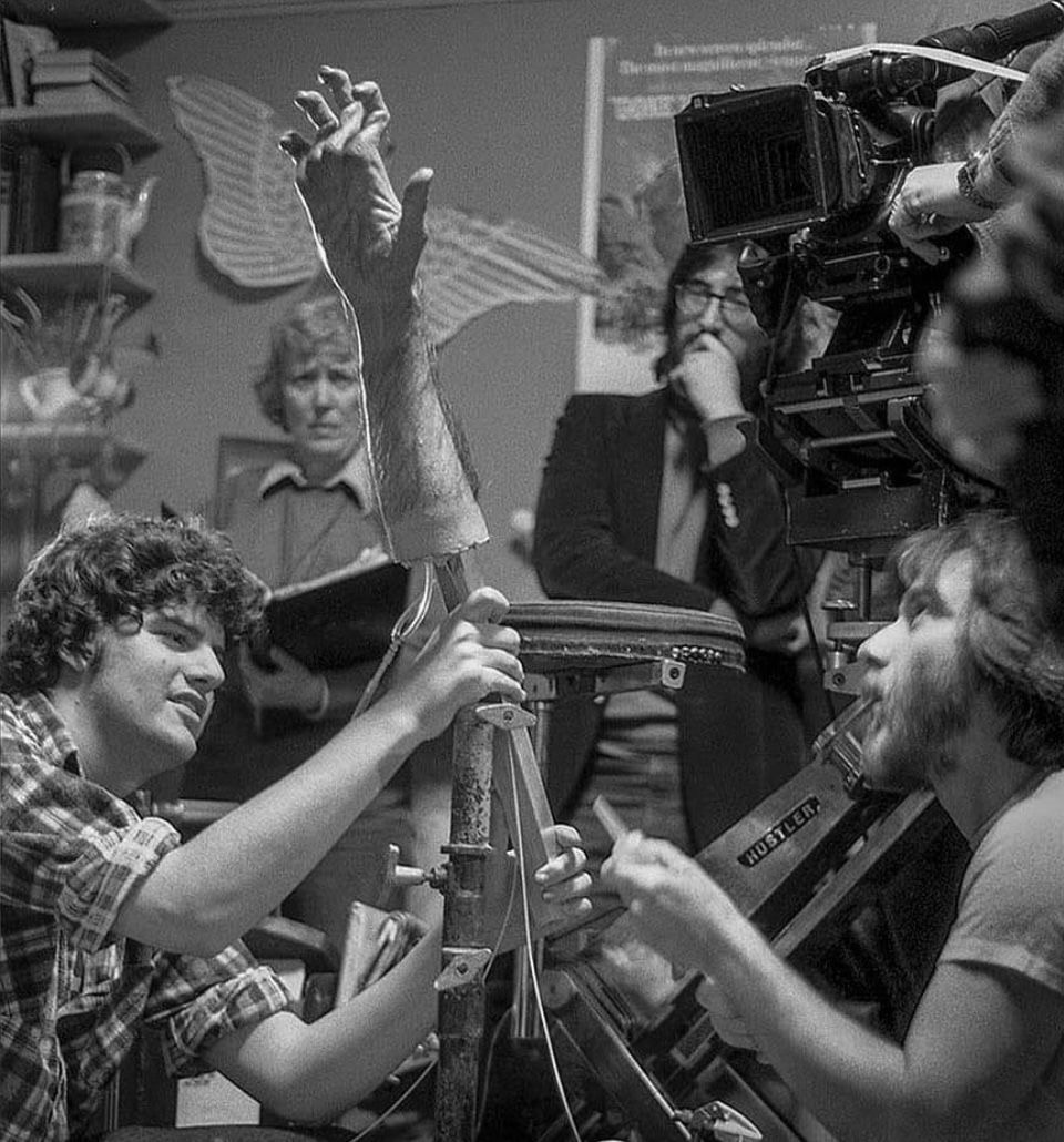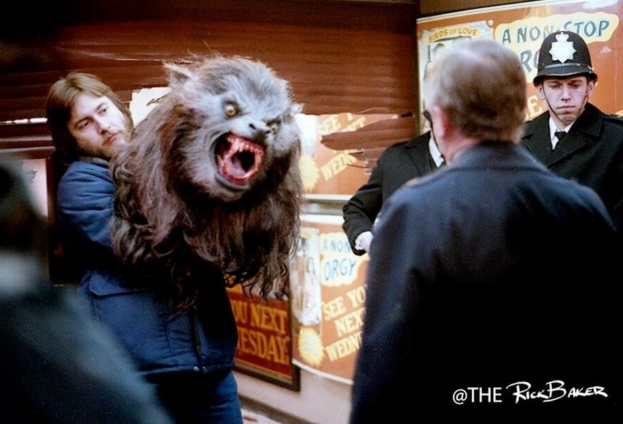 Фото со съемок фильма «Американский оборотень в Лондоне» 1981. Режиссер Джон Лэндис. Разработчик и создатель специального грима Рик Бэйкер.