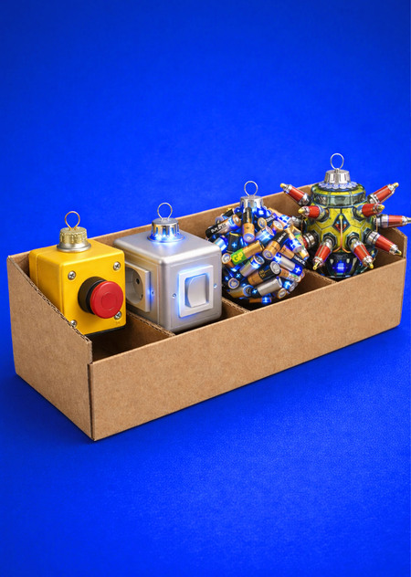 Эта серия ёлочных игрушек объединена общей концепцией «тихая механика» — эстетикой повседневных технических объектов, доведённых до состояния символов.