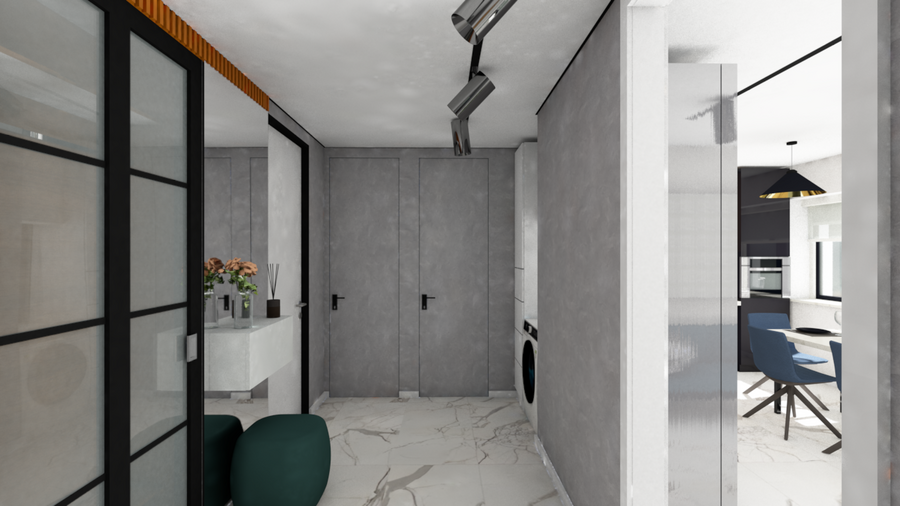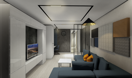 Решением стало создать дизайн интерьера в современном стиле с использованием элементов стиля минимализм. Основные цвета интерьера — белый, тёплые оттенки серого. Контрастные цвета фурнитуры, оконных рам — антрацит, черная слоновая кость. Акцентные цвета в декоративных панелях и отделке мебели — насыщенный оранжевый RAL2011 и лазурно-синий RAL5009.