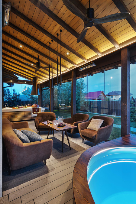 Проект остеклённой веранды при загородном доме решает задачу кругло сезонного использования пространства. Реализована система безрамного остекления, чьи крепления скрыты за дополнительной деревянной обшивкой колонн, балок и фронтона. В цоколь интегрирована подсветка и скрыт направляющий профиль. Использована сосна с защитным тонированным покрытием. Изнутри смонтированы фальшь стропила, а подшивка потолка маскирует черновую конструкцию крыши. Интерьер включает купель, печь и летнюю кухню, а отделка конструктивных элементов переходит в оформление интерьера, обеспечивая целостность и технологичность.
