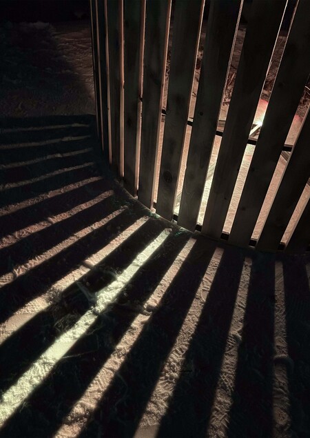 Инсталляции представляет собой полукруглый забор из ряда амбарных досок. Сквозь щели проходят лучи света от источника позади забора. Проходя между светильником и забором, лучи начинают мелькать. Создается атмосфера мистики, загадочности и сказочности.