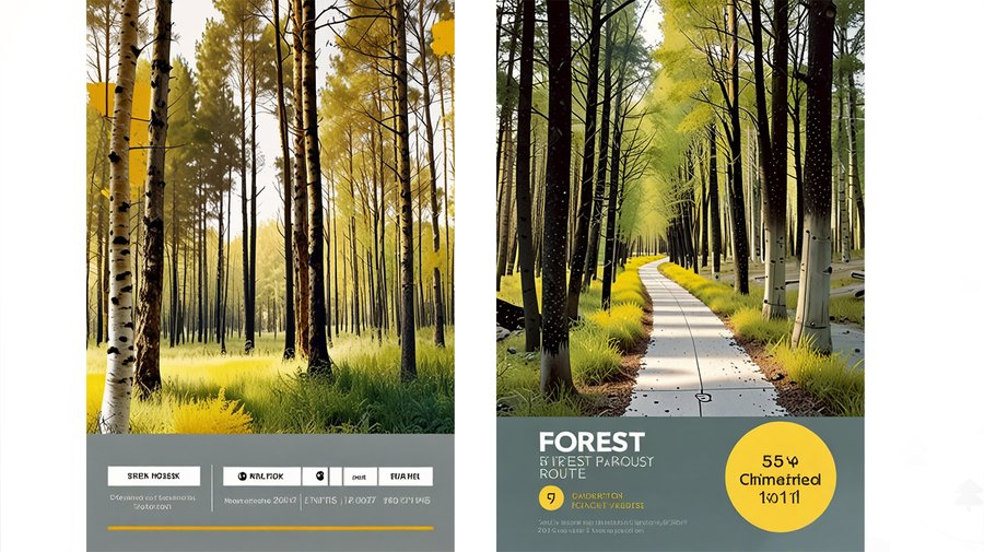 Промт для открыток в recraft: postcards with forest photos and yellow acsents laying on a neutral background