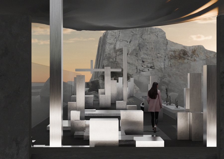 Парк «Куби XXI» был создан мной по мотивам работ скульптора Дэвида Смита. В нём нет деревьев — только камни и металл, чтобы не отвлекать от восприятия формы. Я создала несколько новых скульптур и добавила зону для самостоятельной работы посетителей. Это пространство, где гости могут поучаствовать в мастер-классах по сборке фигур. Люди могут почувствовать себя участниками процесса и лучше понять принципы композиции. Но также есть магазин, в котором они могут приобрести наборы лего для сборки дома. С помощью нейросети Krea.ai я создала целый бренд под названием «Куби XXI». Бренд посвящен наборам лего, как для взрослых, так и для детей. Наборы для взрослых представляют собой тяжелые металлические детали, которые можно собирать за счет магнитов. А детские наборы выглядят как обычное лего, из которого можно собрать работы Дэвида Смита.