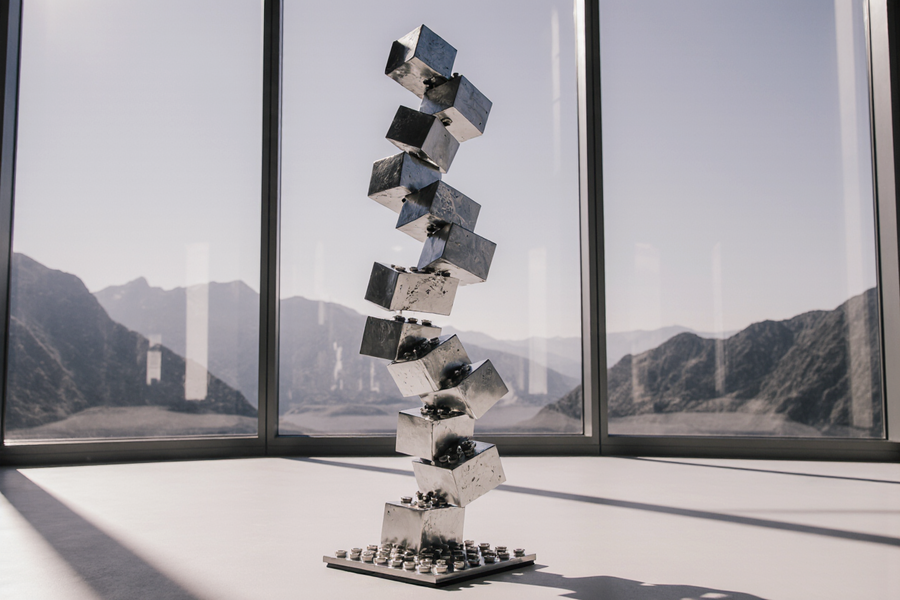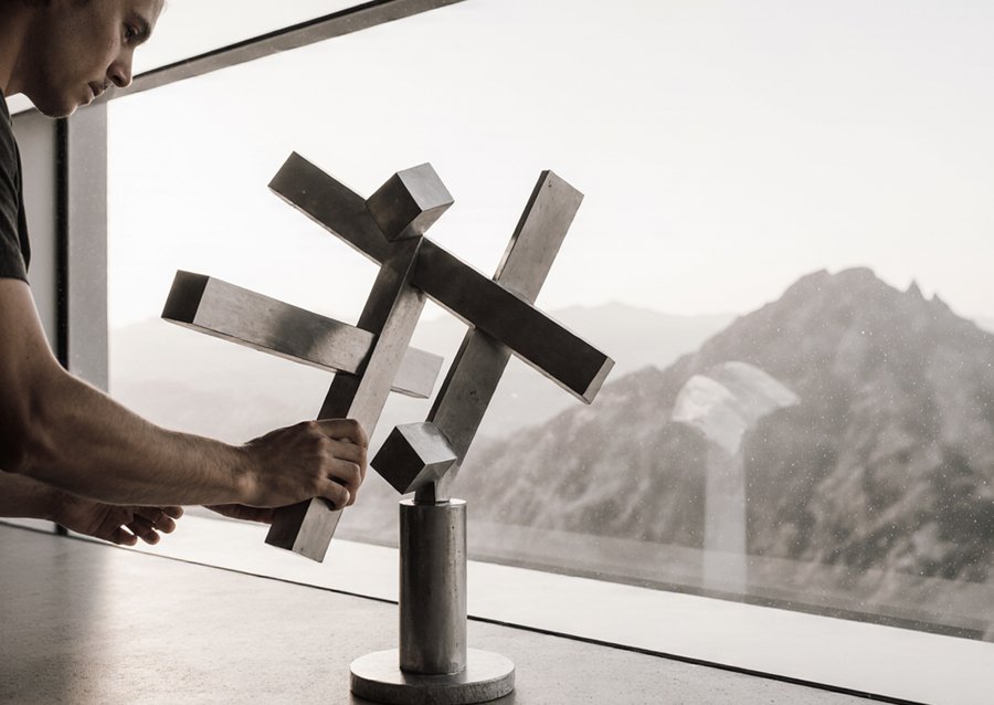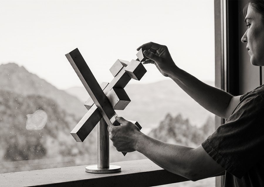 Hands assembling abstract metal sculptures in a sunlit gallery space with large glass windows. The background seen through the windows is a dramatic landscape with rugged mountains and a clear sky, reminiscent of the provided image. The sculptures are composed of brushed metal geometric blocks and forms. The focus is on the careful, manual assembly of these metallic art pieces. Soft, natural lighting casts long shadows. Photorealistic, detailed hands, close-up on the assembly process.