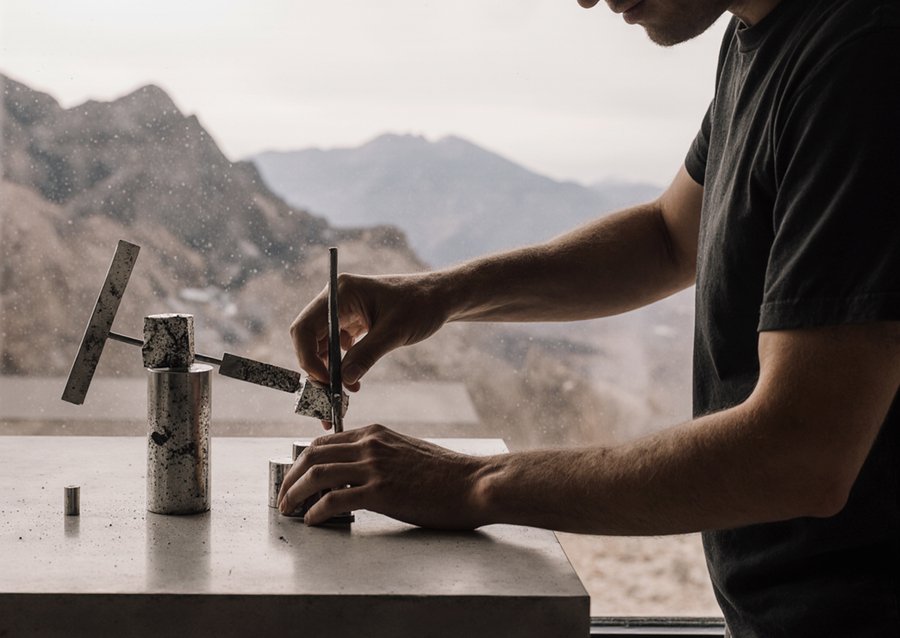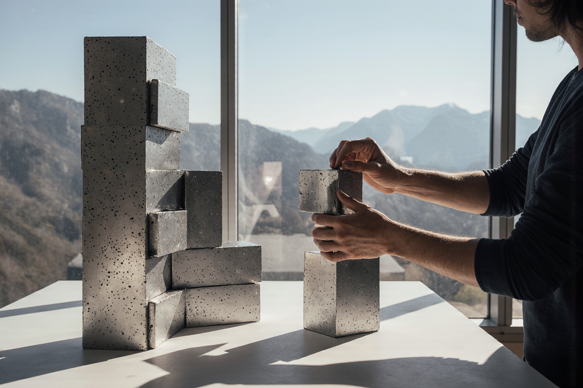 Imagine First-person perspective, close-up shot of stylized hands assembling a small abstract metal sculpture in the style of David Smith. The hands are manipulating geometric metal pieces with precision on a clean, minimalist workbench made of concrete. In the background, visible through a large, expansive window, is a dramatic, stark, rocky, and treeless mountain landscape with a pale, soft sky. Soft, diffused natural light illuminates the scene, emphasizing the textures of the metal and concrete. Architectural photography, minimalist aesthetic, high detail, slightly stylized render, serene mood.