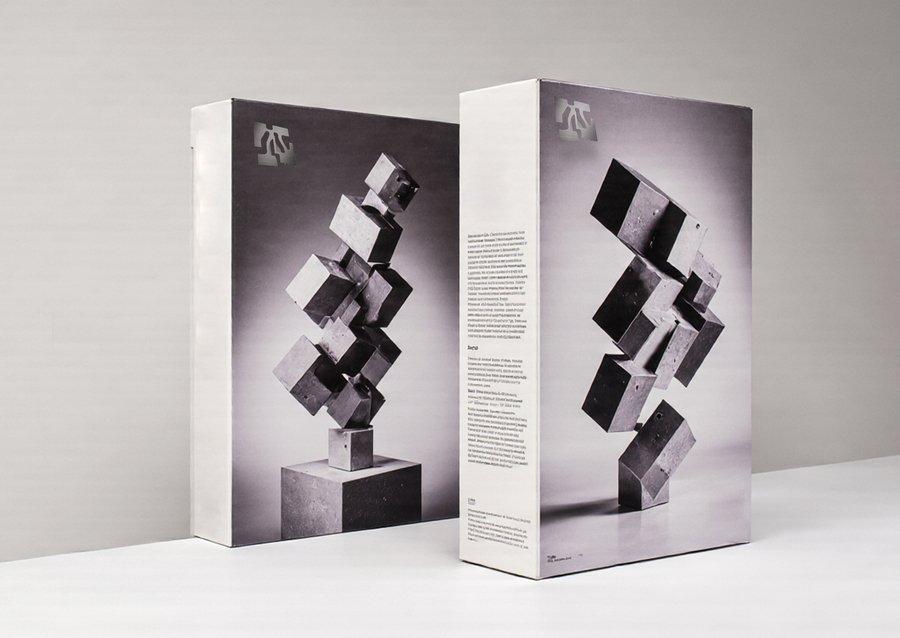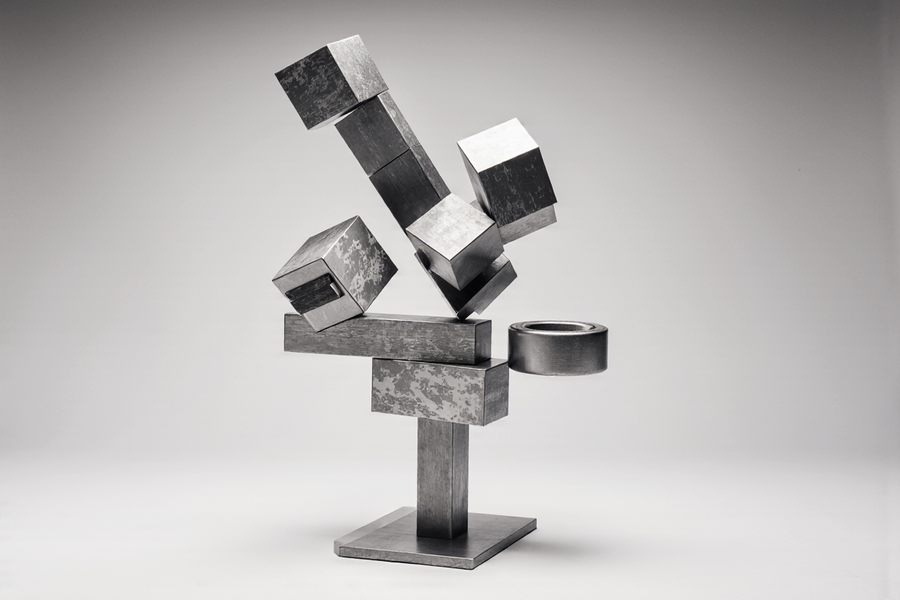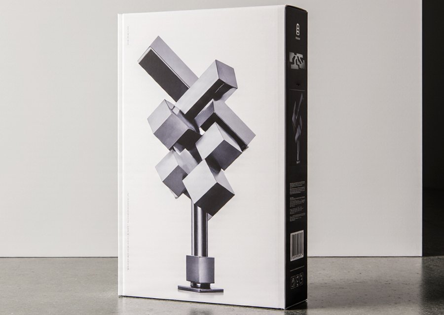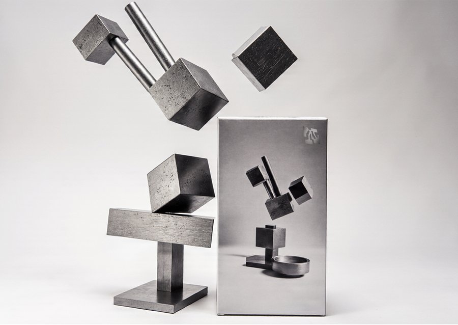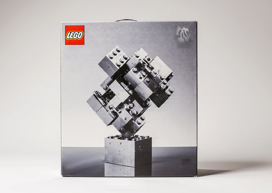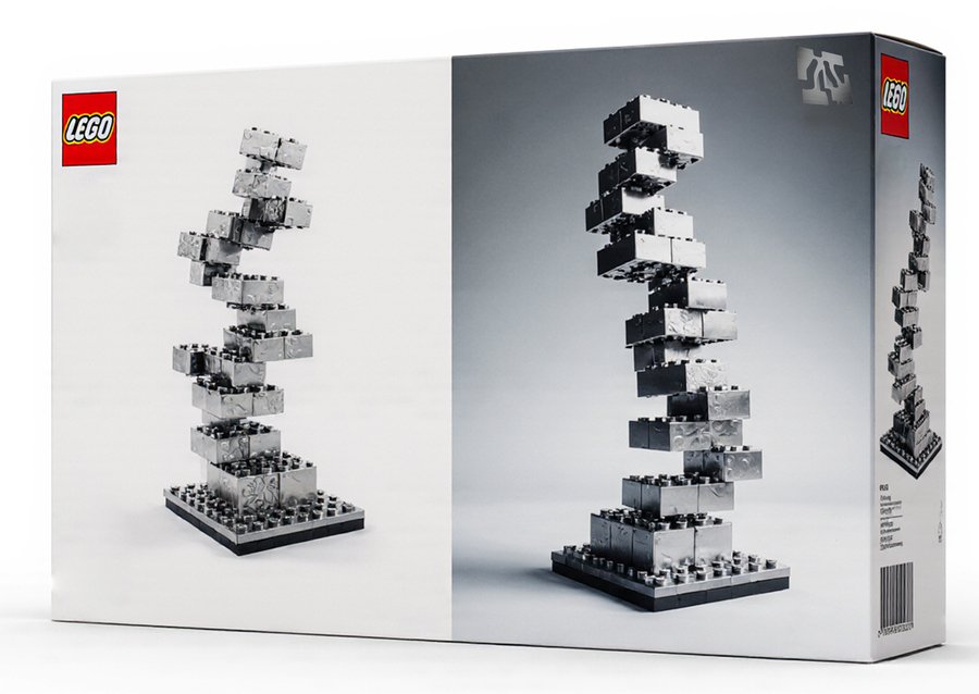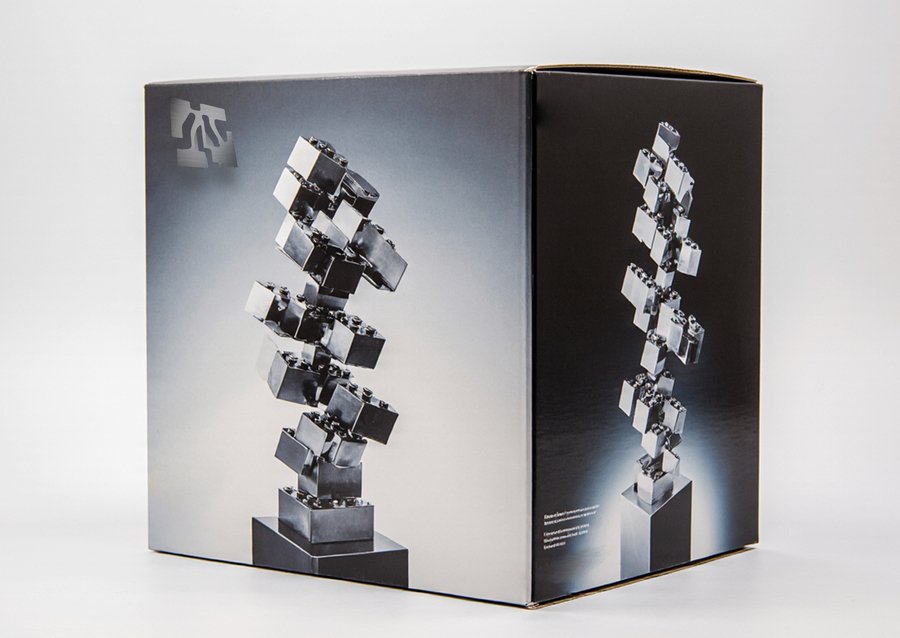 imagine Packaging for a Lego-style building toy made of metallic plates that attach with magnets. The packaging is a sleek, minimalist box with a photographic image of the assembled abstract metallic sculpture on the front. The sculpture is composed of geometric shapes like cubes and rectangular prisms, stacked and balanced precariously on a pedestal. The overall aesthetic is modern, sophisticated, and industrial. Product photography, studio shot, clean background, metallic textures.