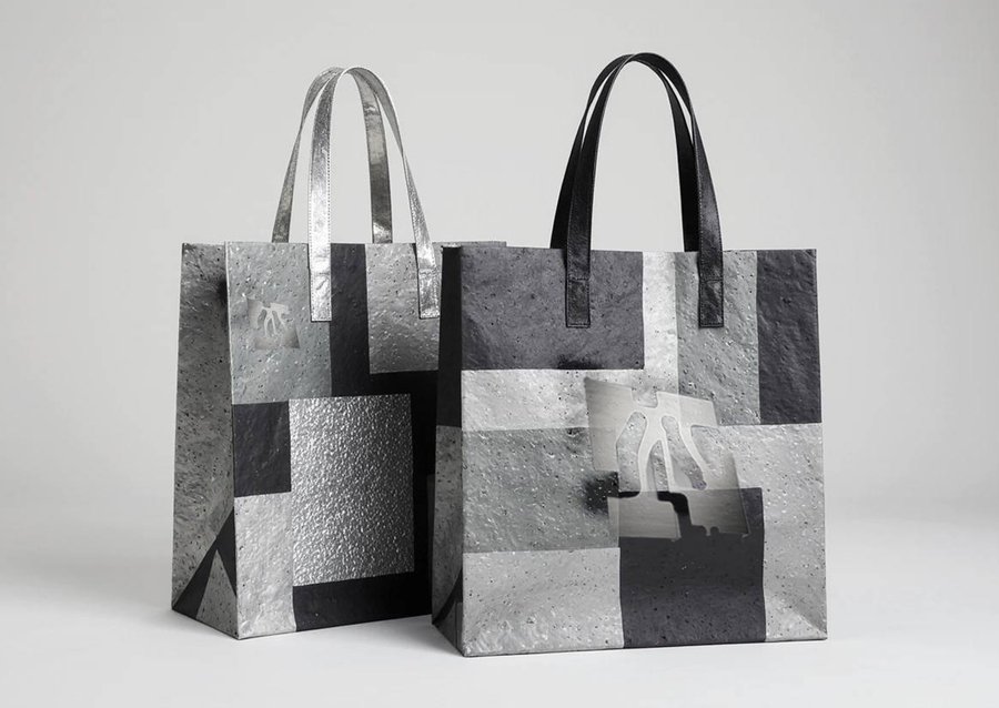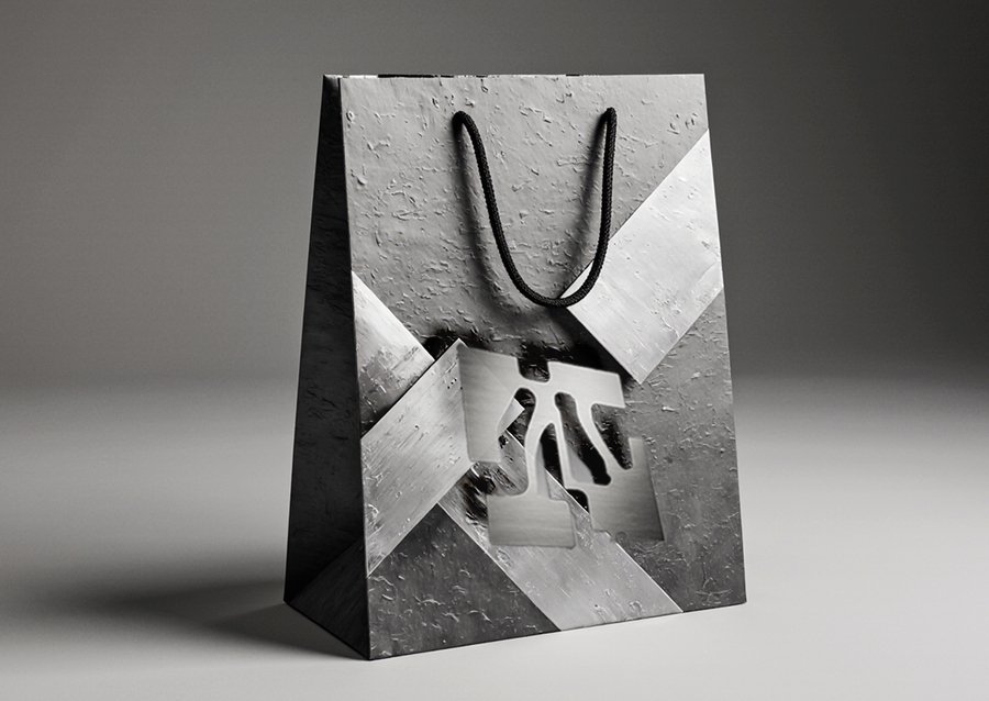 Shopping bags inspired by the sculpture of David Smith. The bags feature bold, abstract geometric designs made of simulated metal textures, reminiscent of Smith’s steel sculptures. Dominant shapes include cubes, cylinders, and sharp angles. The designs are reminiscent of Constructivist art, with visible «welded» seams and industrial aesthetics. The bags are made of textured paper in shades of gray and silver. Artistically stylized product photography, high contrast, strong shadows.