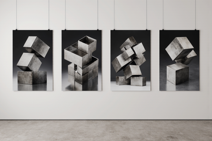 imagine Interior of a modern, minimalist retail store specializing in a unique building toy. The store features clean lines, polished concrete floors, and metal shelving. Display shelves are filled with numerous sleek, monochrome boxes, each showcasing a photographic image of an abstract metallic sculpture assembled from magnetic plates. The sculptures themselves, in various configurations, are also displayed as finished examples. The store has a gallery-like atmosphere, with soft, diffused lighting. Product photography, retail design, modern showroom, art object display.