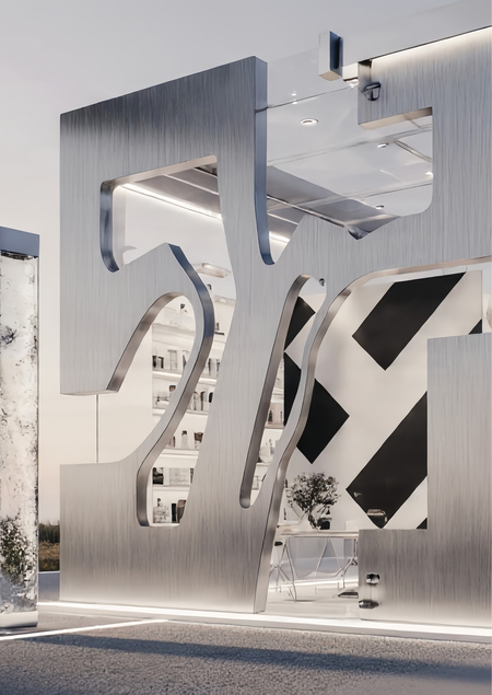 A modern, sleek glass exhibition booth in a park setting at dusk. The booth is illuminated from within and features large glass panels. A metallic, brushed steel logo, featuring abstract, interconnected geometric forms, is prominently and cleanly applied to the central glass facade of the booth, clearly visible from the outside. The surrounding park landscape is visible, with soft twilight lighting. Highly detailed, photorealistic, cinematic atmosphere.