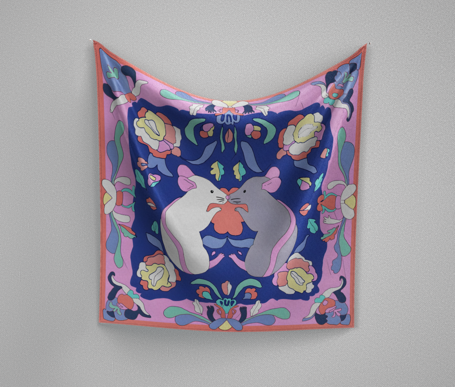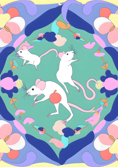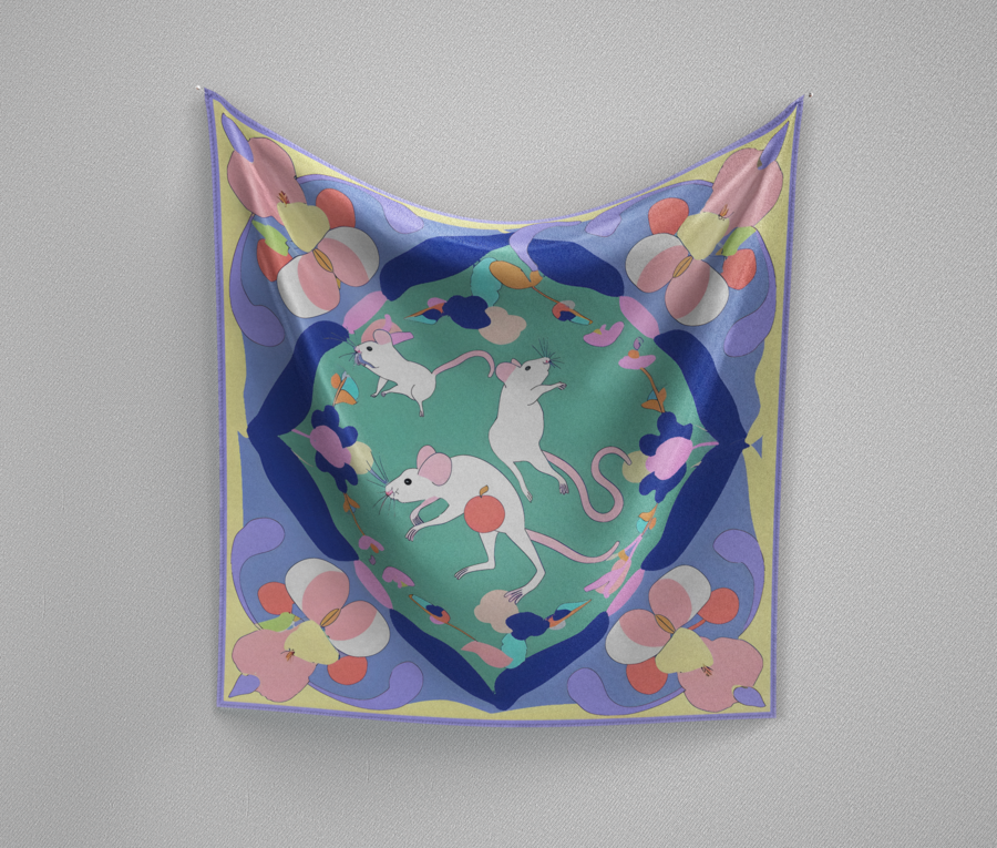 Промт: A whimsical flat vector design featuring a pattern of adorable rats holding various vegetables like carrots, lettuce, and radishes. The rats are arranged in a symmetrical manner, forming a repeating pattern that would make a perfect scarf. The overall design is bright, colorful, and full of charm, with a playful twist on traditional patterns. The overall design has a flat vector style, making it perfect for digital artwork.