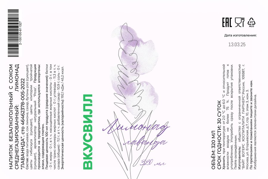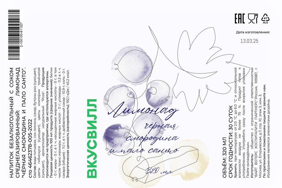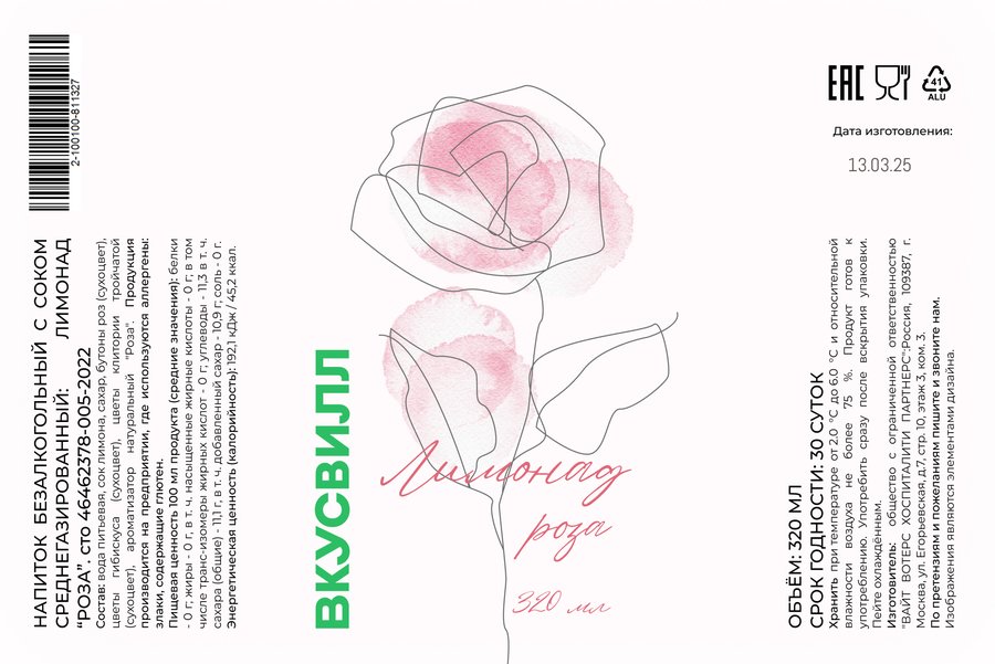 Логотип Вкусвилл, выполненный в фирменном цвете, делает лимонад узнаваемым для покупателей.